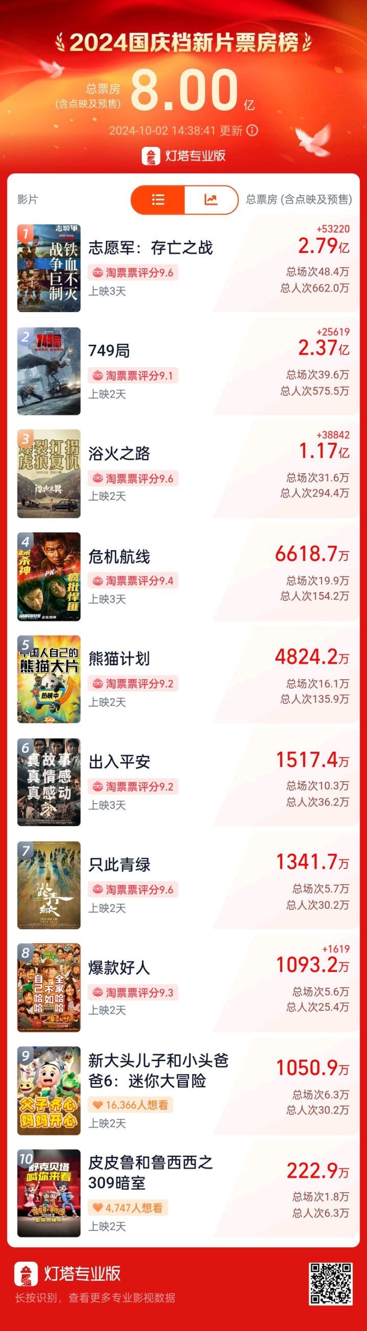 2024国庆档票房破8亿,《志愿军:存亡之战》领跑新片