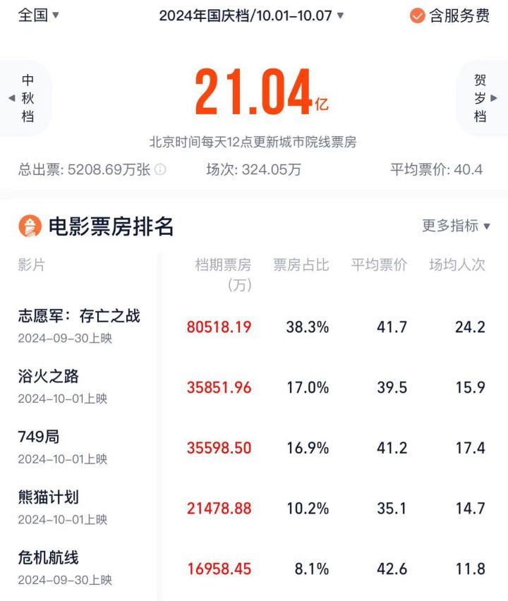 2024国庆档票房破21亿,《志愿军2》独占鳌头