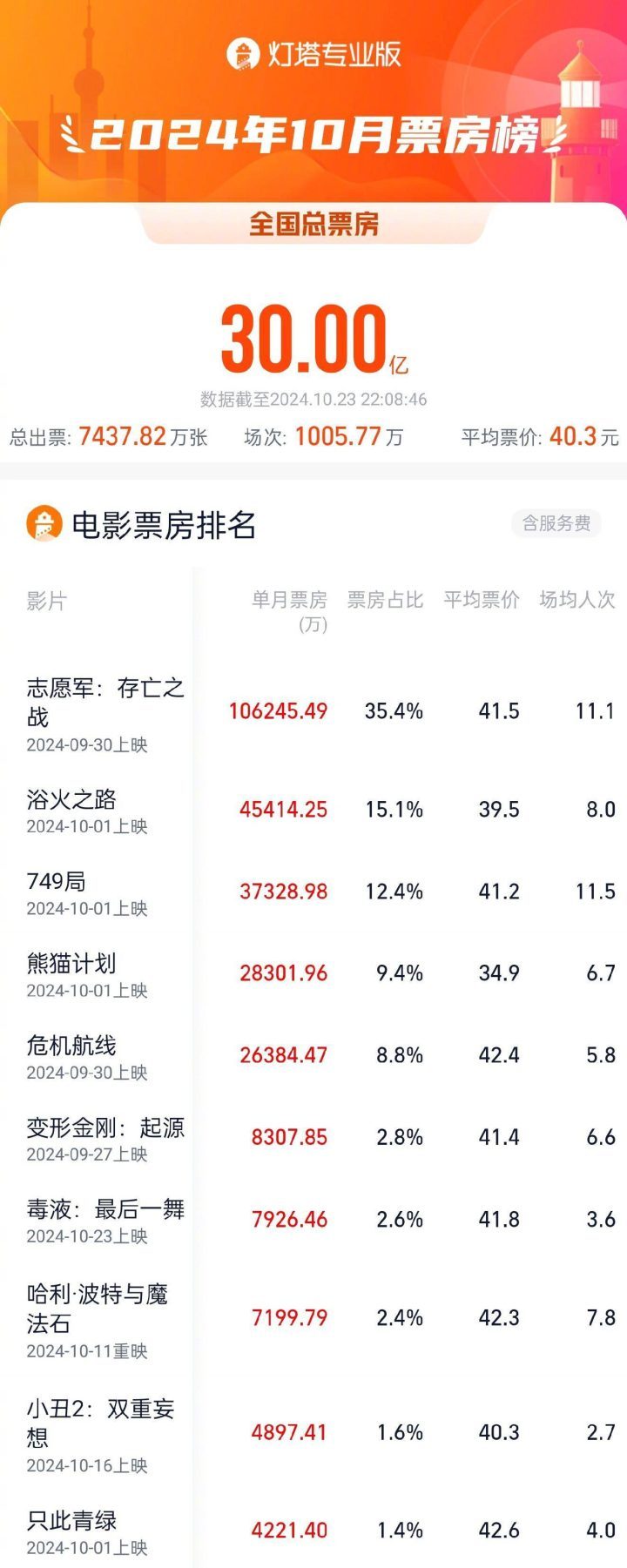 《志愿军2》领跑,2024年10月总票房破30亿