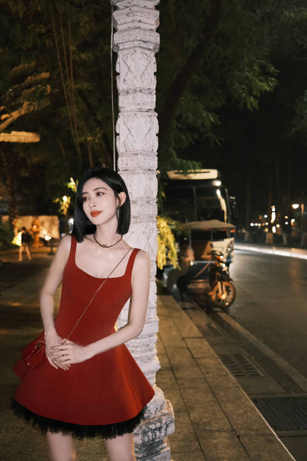 照片中的孟子义,双手捧脸,嘟着嘴,看起来超级可爱。她的身材苗条,穿上那件红色吊带裙,更是显得优雅动人。红色裙子在节日的氛围中显得特别应景,也衬托出她明艳动人的形象。孟子义蹲在路边,这个场景虽然简单,但却让她看起来更加接地气,给人一种邻家女孩的感觉。