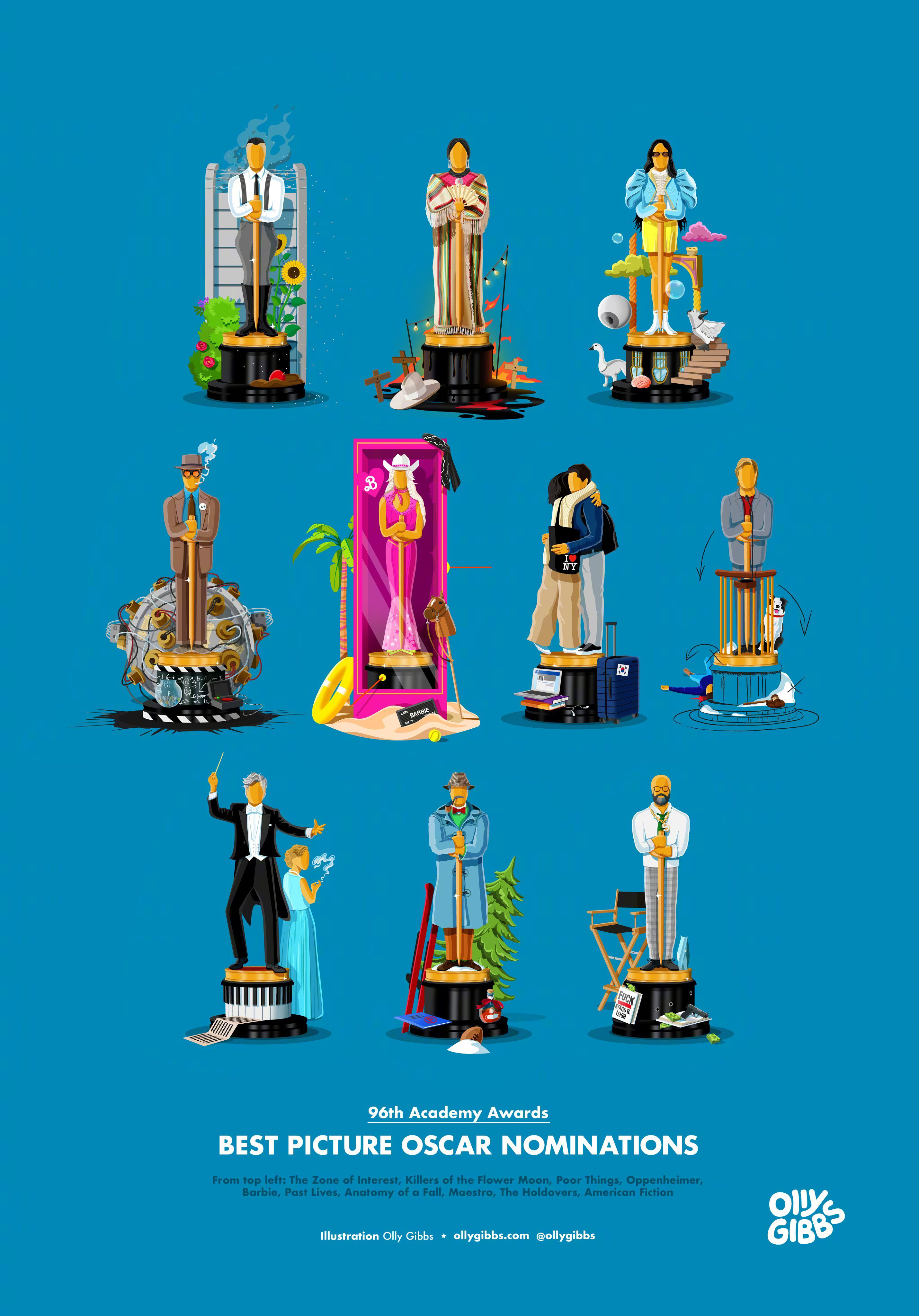 第96届奥斯卡金像奖即将在好莱坞杜比剧院举行,这一次的入围“最佳影片”艺术海报由知名艺术画师Olly Gibbs亲自创作。Olly已经连续11年为奥斯卡设计海报,这次的作品可谓是细节丰富、可爱有趣。