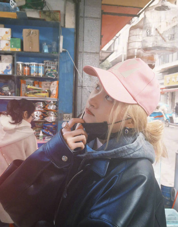 关晓彤低丸子头配金发粉帽,演绎甜美与松弛