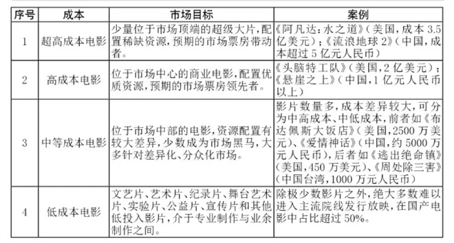 说到电影成本,清华大学的尹鸿教授有个分类,把国产电影投资成本分为超高成本电影(3亿元以上)、高成本电影(1亿元至3亿元)、中等成本电影(1000万-1亿元)和低成本电影(1000万元以下)。中等成本电影还可以细分为中高成本(5000万元至1亿元)和中低成本(1000万—5000万元)。这些中等成本的电影,虽然资源配置上和高成本电影没法比,但它们往往能成为市场的黑马,而且给年轻电影人提供了更大的发挥空间,有时候真的能创造出奇迹。