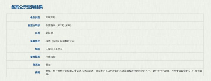 《定风波》,这部动画电影的立项意味着国内动画电影创作的又一次飞跃。以苏轼的人生为题材,从乌台诗案入手,讲述了苏轼在逆境中坚韧不拔、创作佳作的故事,展现了宋朝文化的繁荣和苏轼的卓越才华。